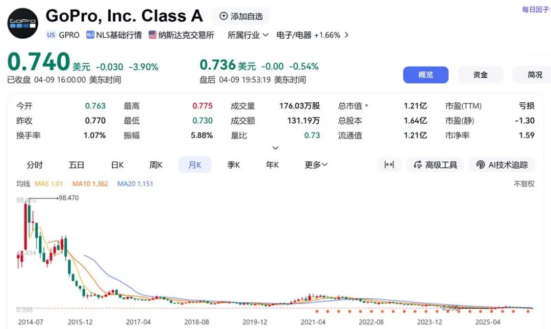 司的立场改变二级市集对公,明题目更能说。14年20,高至98.47美元/股GoPro股价一度冲,130亿美元市值高达约;26年4月而到了20,1美元/股股价已跌破,1.2亿美元市值仅剩约,进步99%蒸发幅度。为消费电子新标杆的公司一家曾被资金市集追捧,家始创企业相差无几现在的市值已与一。道理上说从某种,正正在体验的GoPro,绩的下滑不但是业,话的体例性崩塌更是一个贸易神。